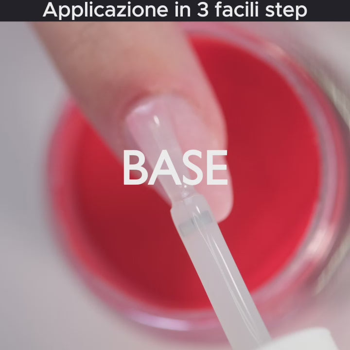 The process is very simple. You start with a classic manicure, cleaning the nail with a delicate file. Then you apply the base gel polish and then dip the nails in the powder base. Then you spread the base gel again and then dip the nail in the color. This last step can be repeated if you want to obtain a more intense color. Finally, you spread the activator and close with the sealing top coat to make the color super bright.